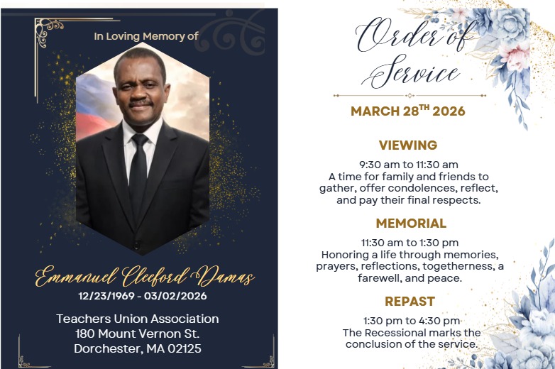 Dorchester, MA — Hundreds of family members, friends, community leaders, and supporters gathered today, March 28, 2026, at the Teachers Union Association in Dorchester to honor the life of Emmanuel Cleeford Damas, whose passing has deeply shaken the Haitian community both locally and nationally. Haitian Globe was present on site, capturing the moment and witnessing firsthand the outpouring of love and solidarity shown to the family.
